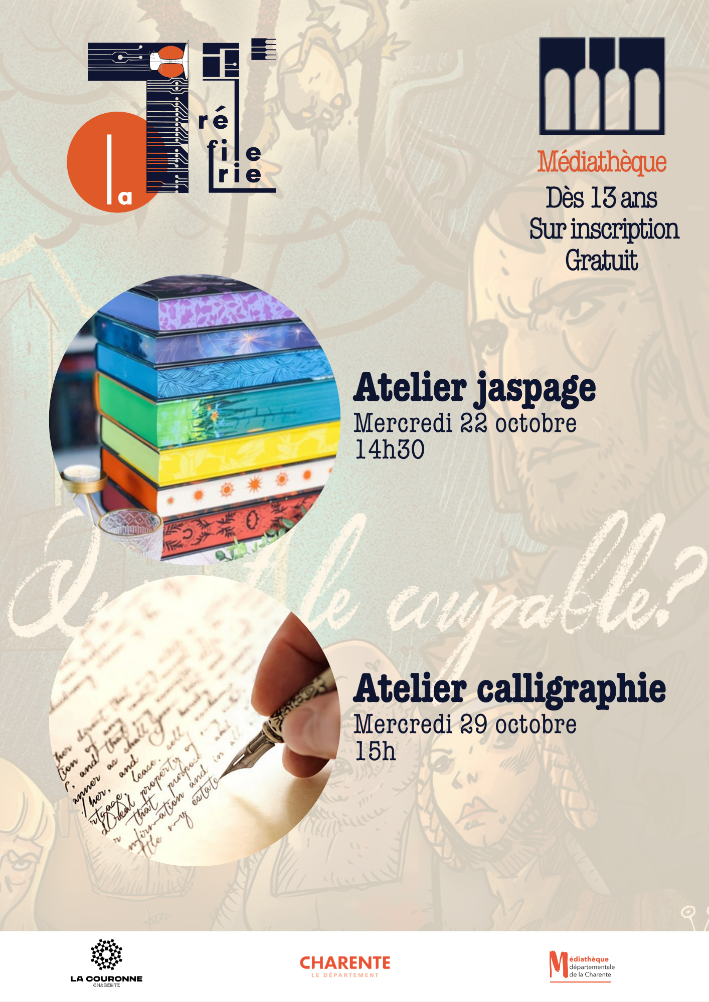 Lux in Tenebris Date : Du mercredi 15 octobre au 11 novembre 2025 Lieu : Médiathèque – La Tréfilerie Infos Jeu de rôle immersif seul·e ou à deux En partenariat avec la Médiathèque départementale de la Charente En chemin vers la cour de Gaston Fébus, Jehan Froissart et son page sont surpris par une tempête. Mais [...] Lire la suite »