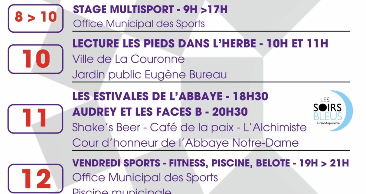 Dans le cadre de la 6ème édition des Soirs Bleus, la Ville de L’Isle d’Espagnac vous propose, le vendredi 28 juin 2024 : Concert Audrey et les Faces B 20h30 […]
