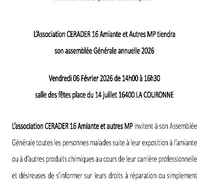 Assemblée Générale Annuelle 2026 – CERADER 16 Amiante et autres MP Vendredi 6 février 2026 – 14h à 16h30 Lieu : Salle des fêtes, Place du 14 juillet, 16400 La Couronne L’association CERADER 16 Amiante et autres MP invite toutes les personnes malades suite à leur exposition à l’amiante ou à d’autres produits chimiques au […] Lire la suite »