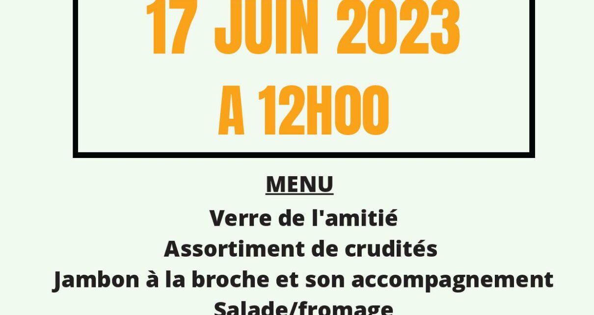 Organisé par la Société de Chasse De BOUËX Samedi 17 Juin 2023 à 12H00 MENU Verre de l’amitié Assortiment de crudités Jambon à la broche et son accompagnement Salade/fromage Dessert Café Vin compris ADULTES: 20€ ENFANTS jusqu’à 10 ans : 10€ Réservation avant le 05 Juin 2023 aux heures de repas 06 85 63 49 […] Lire la suite »