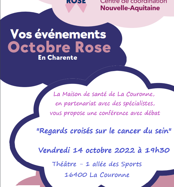 La Maison de Santé de la Ville de La Couronne en partenariat avec des professionnels de santé vous proposent une conférence débat : « Regards croisés sur le cancer du sein ». Entrée libre – Informations : 05 45 65 99 00