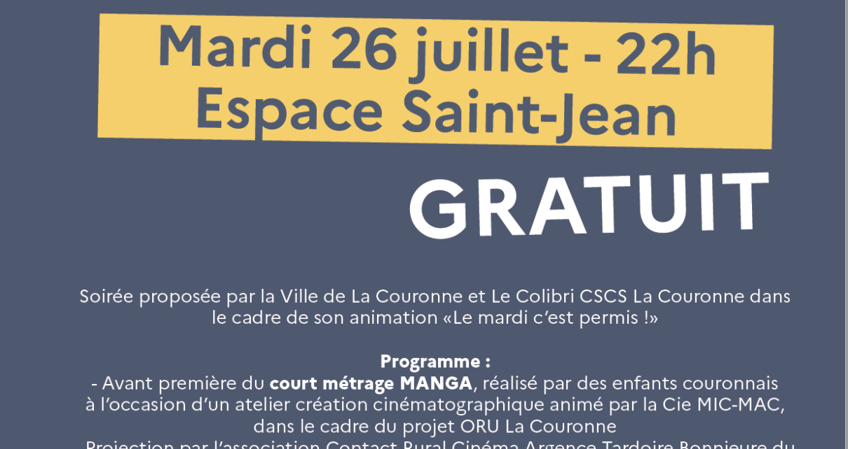 Soirée proposée par la Ville de La Couronne et Le Colibri CSCS La Couronne dans le cadre de son animation «Le mardi c’est permis !» Programme : – Avant première du court métrage MANGA, réalisé par des enfants couronnais à l’occasion d’un atelier création cinématographique animé par la Cie MIC-MAC, dans le cadre du projet […] Lire la suite »
