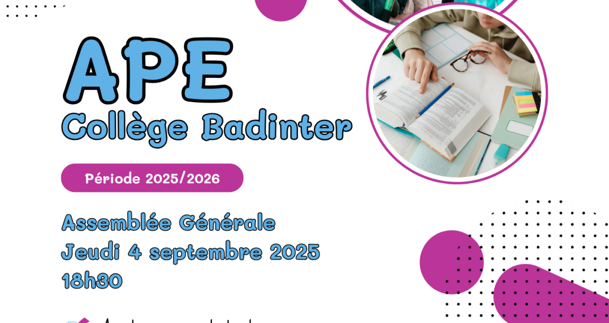 Assemblée Générale de l’APE du Collège Élisabeth et Robert Badinter le jeudi 4 septembre 2025 à 18h30 RDV au Collège Élisabeth et Robert Badinter