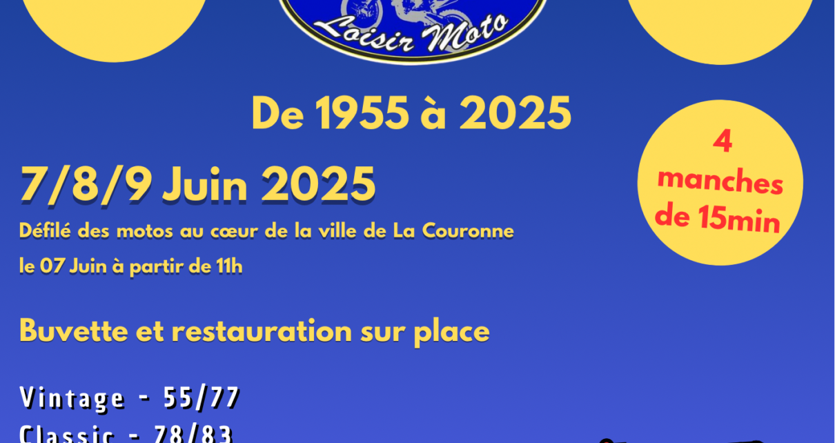 Défilé des motos au cœur de la ville de La Couronne le 07 Juin à partir de 11h 7 catégories 2 jours de courses 4 manches de 15min Buvette et restauration sur place Entrée gratuite pour toutes et tous ! Contact : 07 60 36 08 23