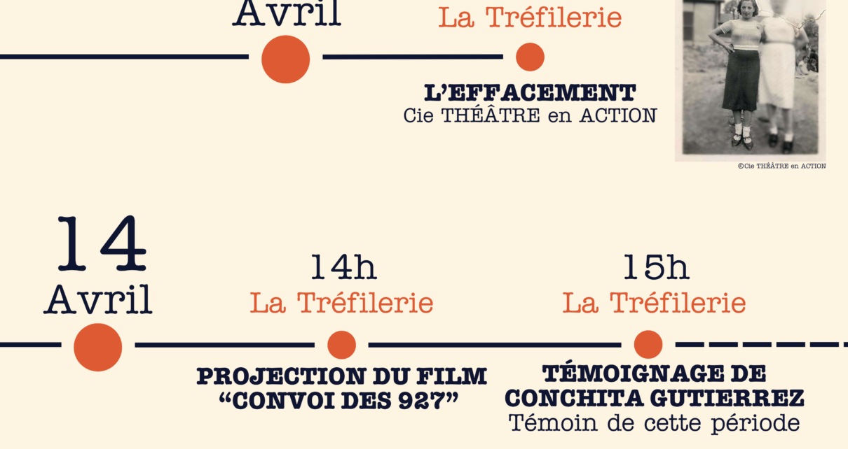 Le dimanche 13 avril 2025 à 17h Spectacle L’Effacement par la Compagnie Théâtre en Action Théâtre de La Tréfilerie Le lundi 14 avril 2025 À 14h – Projection du film “Convoi des 927” Théâtre de La Tréfilerie À 15h – Témoignage de Conchita GUTIERREZ, témoin de cette période Elle a vécu au camp de concentration des […] Lire la suite »