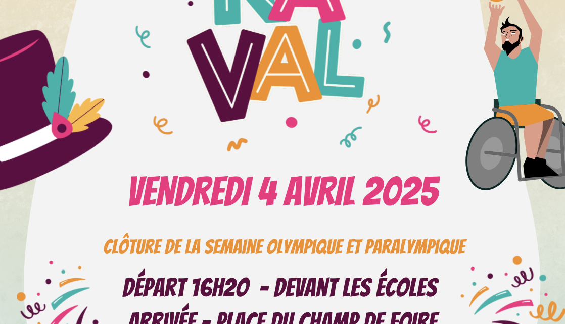 Clôture de la semaine olympique et paralympique Enfants & parents venez déguisé·es ! Au programme Cavalcade, goûter offert & final enflammé Départ à 16h29 devant les écoles et arrivée Place du Champ de Foire