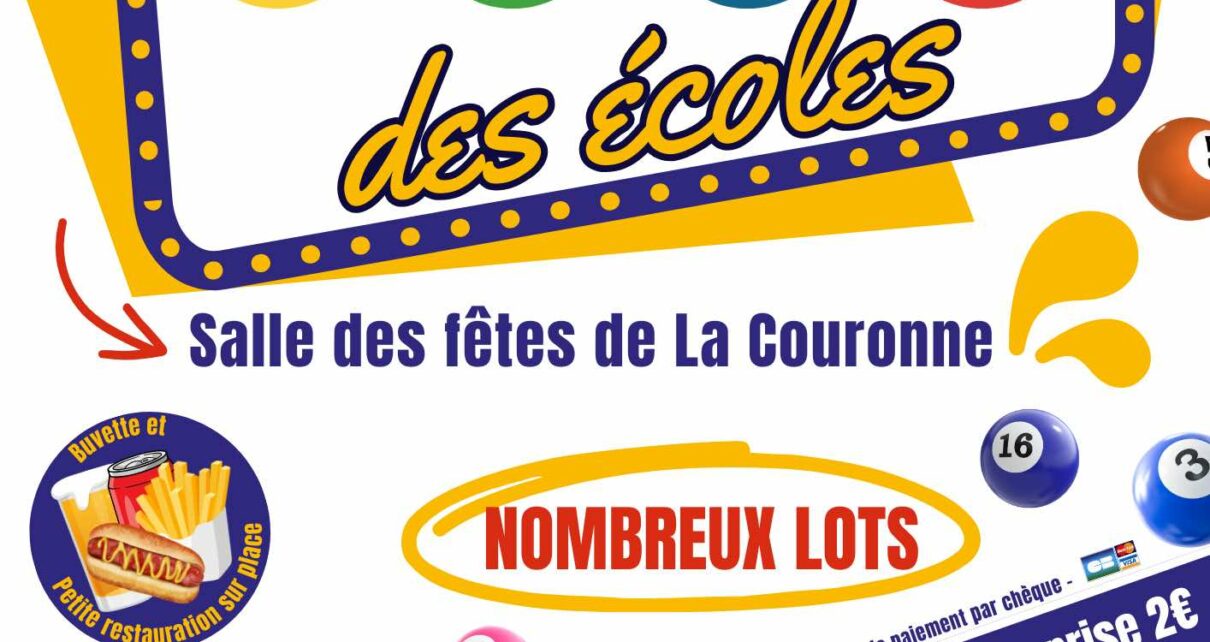 Lieu : Salle des fêtes de La Couronne Ouverture des portes à 18h Début du loto à 20h Buvette et petite restauration sur place